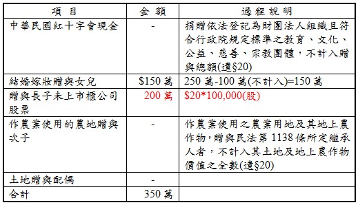 臺北市民劉先生107年度有下列之贈與行為。捐贈中華民國紅十字會現金$220萬;結婚嫁妝$250萬贈與女兒;贈與長子未上市櫃公司股票10萬股,贈與當日股票每股收盤價$25,每股資產淨值$20;將作農業使用的農地贈與次子,市價$500萬,公告現值$300萬;將市價$1,000萬,公告現值$700萬的土地贈與配偶。試問劉先生107年度的贈與總額? (A)$350萬 (B)$400萬 (C)$450萬 (D)$650萬。 【108記帳士】